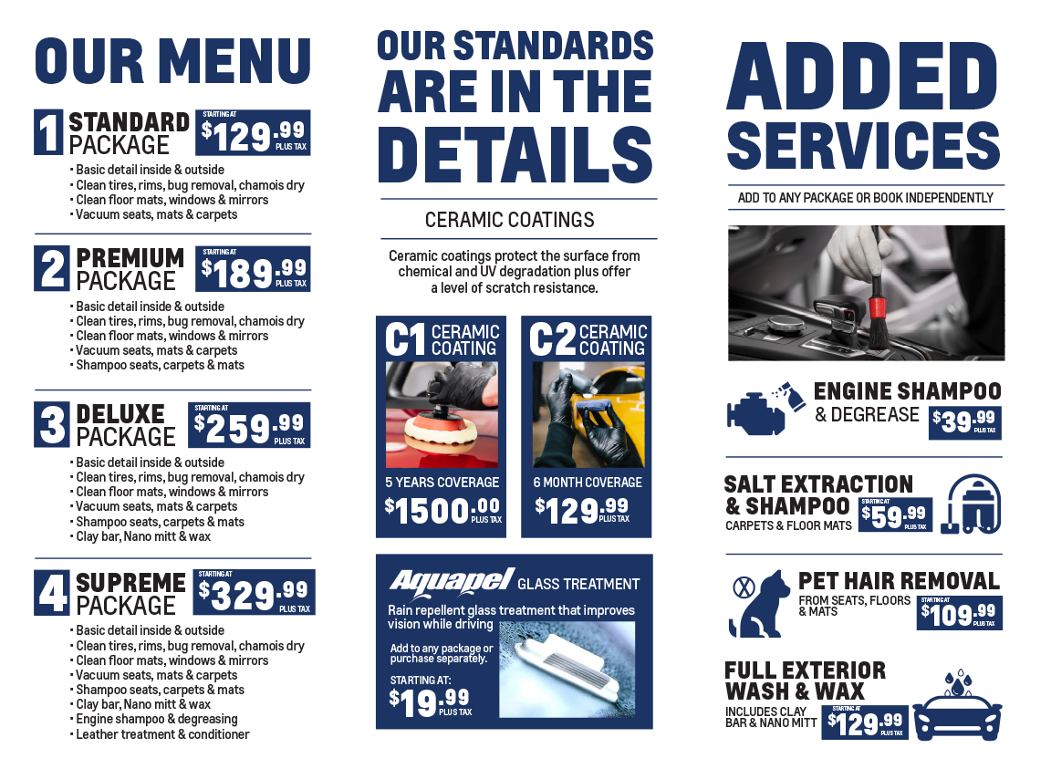 Our car detailing services range from a detail inside and out, to professional-level detailing which includes wax, clay bar, engine shampoo, and more! We have four vehicle detailing packages that are customizable based on your individual needs. We use a full line of products provided through Auto Valet Premium®, and we have a full staff of professionally trained detailers across two locations, 85 Kenmount Road (Hickman Chevrolet Cadillac), and 151 Kenmount Road (Hickman Auto Spa). Check out our detailing and car wash service pricing below.
